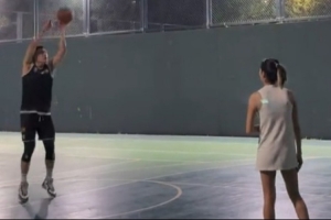 付豪配文写道:“美好的一切。”视频中,付豪在练习投篮,其妻子帮他捡球。