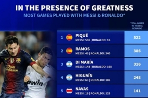 体育资讯9月11日讯 《转会市场》统计了曾先后和梅西、C罗都有过共事经历的球员的并肩作战场次情况,皮克居首。