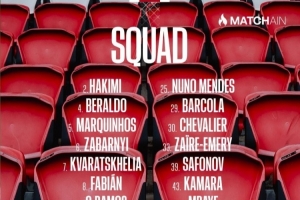 后卫:2-阿什拉夫、4-贝拉尔多、5-马尔基尼奥斯、6-扎巴尔尼、21-卢卡斯-埃尔南德斯、25-努诺-门德斯、43-诺哈姆-卡马拉、51-帕乔