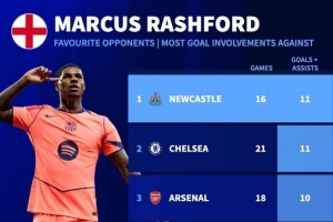 体育资讯9月19日讯 巴萨在本轮欧冠焦点战2-1力克纽卡斯尔,拉什福德双响建功。数据统计显示,纽卡也是拉什福德生涯进球最多的对手之一。