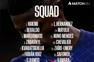 后卫:2-阿什拉夫、4-贝拉尔多、5-马尔基尼奥斯、6-扎巴尔尼、21-卢卡斯-埃尔南德斯、25-努诺-门德斯、43-卡马拉、51-帕乔