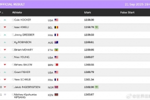 体育资讯9月21日讯 东京田径世锦赛男子5000米决赛,巴黎奥运会1500米冠军、美国选手科尔-霍克第一次出战世界大赛的5000米就凭借强悍的冲刺能力一举杀出,直接奠定胜局,12分58秒30夺冠!