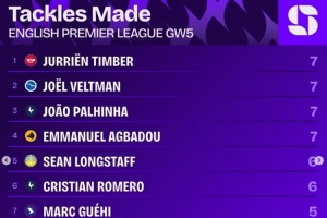 体育资讯9月24日讯 英超第5轮战罢,squawkafootball列各项数据排行,廷伯、帕利尼亚等四名球员是本轮完成抢断次数最多的球员,各有7次。