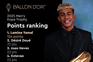 体育资讯09月27日讯 金球奖官方今天公布了男子科帕奖的得分细节,其中亚马尔124分成功卫冕,以52分的优势领先于获得72分的杜埃。阿森纳小将斯凯利和里尔小将布阿迪未能在评选中获得分数。