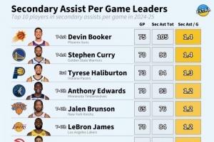体育资讯9月28日讯 今天,数据媒体Extra列出了24-25赛季场均间接助攻(助攻传球之前的那次传球)前10,具体为:
