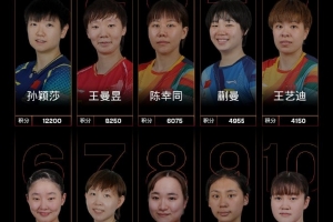 女子单打:孙颖莎排名第一、王曼昱排名第二、陈幸同排名第三、蒯曼排名第四、王艺迪排名第五,陈熠排名第九、石洵瑶排名第12,钱天一排名第19,何卓佳排名第20,覃予萱排名第29,范思琦排名第38,王晓彤排名第43,纵歌曼排名第44。