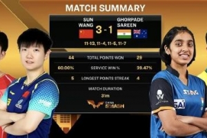 四局比分:11-13,11-4,11-5,11-7。
