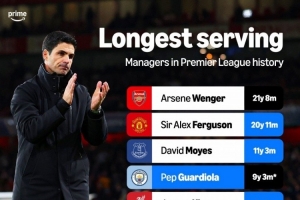 英超历史连续执教一家俱乐部时间排名: