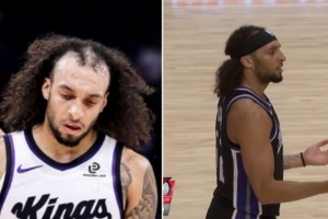 在此前对阵猛龙的季前赛中,国王官方社媒晒出的一张照片可以看到德文-卡特的发际线已经非常靠上了,而这张图也迅速在网络上流传。而在上一场对阵开拓者的比赛,德文-卡特就带上了发带遮盖发际线。