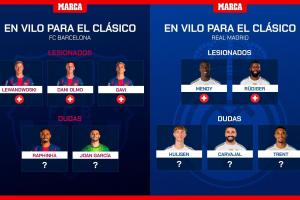 体育资讯10月17日讯 国际比赛日结束,联赛回归。本月月底西班牙国家德比便将打响,今日马卡盘点了国家德比可能伤缺的人员。