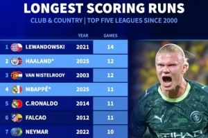2.哈兰德,2025年,连续12场进球(当前纪录)